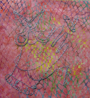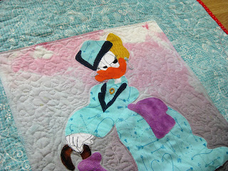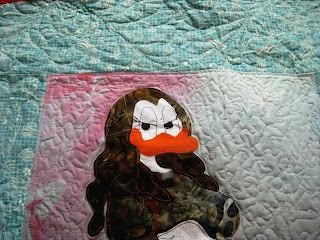 By the way, I am not too sad about the bleeding because I was planning to applique flowers around the two Lady Ducks anyway, so no problem there... plus the slight pink tone of the background now makes it more integrated with the other colors of the piece :)