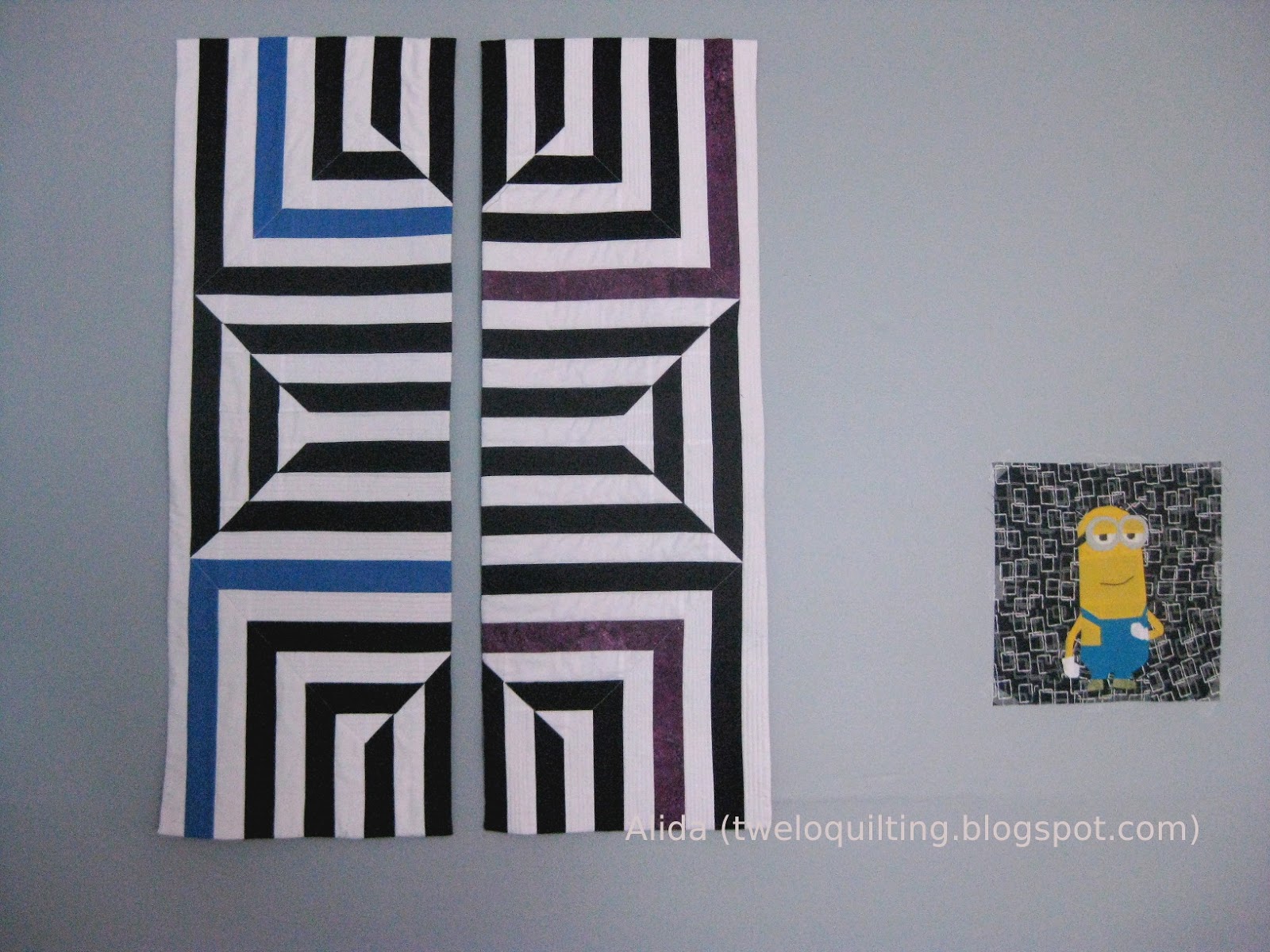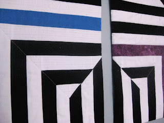 The two halves are quilted in complementary ways: straight quilting on the white sections of the X (and black sections on the background) for the blue half, quilting on the black sections X (and white sections on the background) for the purple half.